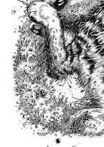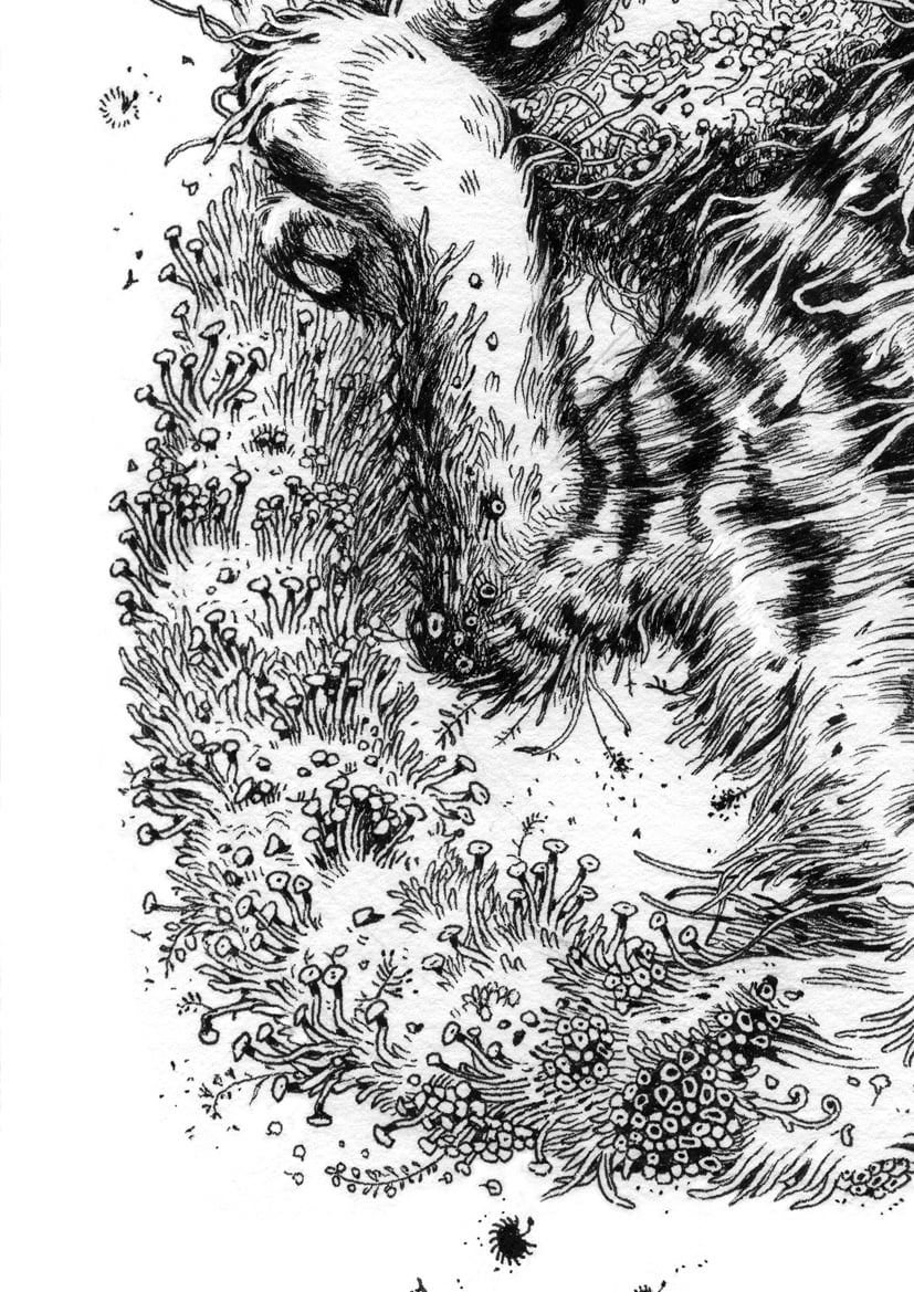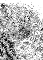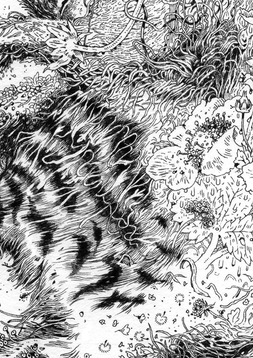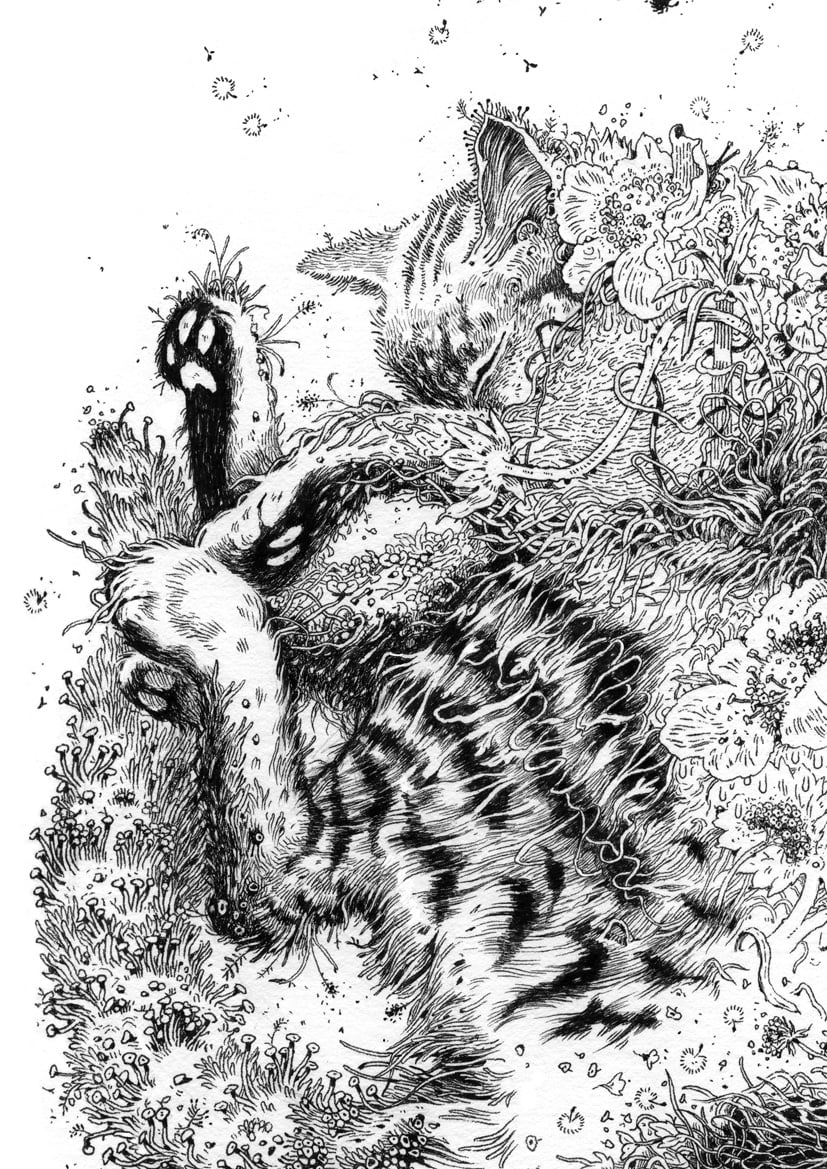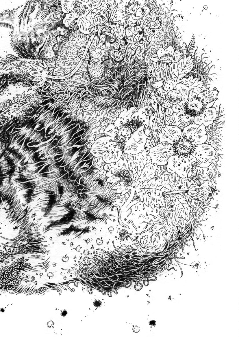 As a child I loved finding stray cats and bringing them home. Unfortunately, I had to do this in secret because my grandmother would never allow it. She really loved pets and flowers (that’s where I get my passion from) but even she had limits. So I was forced to hide the new arrivals in my room, in a box, in the closet, under my bed or in my bed. I loved to sit for hours stroking and caring for them, they needed me and I needed them. Usually they were all discovered after a couple of days and set free. That compulsion, the strong desire I had to befriend another little soul guides all these new artworks. With my pen and brush I stroke them for hours, attend to every tiny detail and fix every part of them, and all are lovingly adorned with beautiful flowers. I can make them happy and carefree and we can be together on the paper. The pets in the artworks are still not mine, but I no longer take them without asking. Instead, their owners kindly send me photos of their beloved creatures asleep. Influenced by the pose, shape and mood, I recreate a childhood memory of all the lost pets that I briefly loved and held before they were taken away. Now, undiscovered, they sleep peacefully and merge with their beds of vibrant flowers. Safe there, they’ll never go away and never be forgotten.