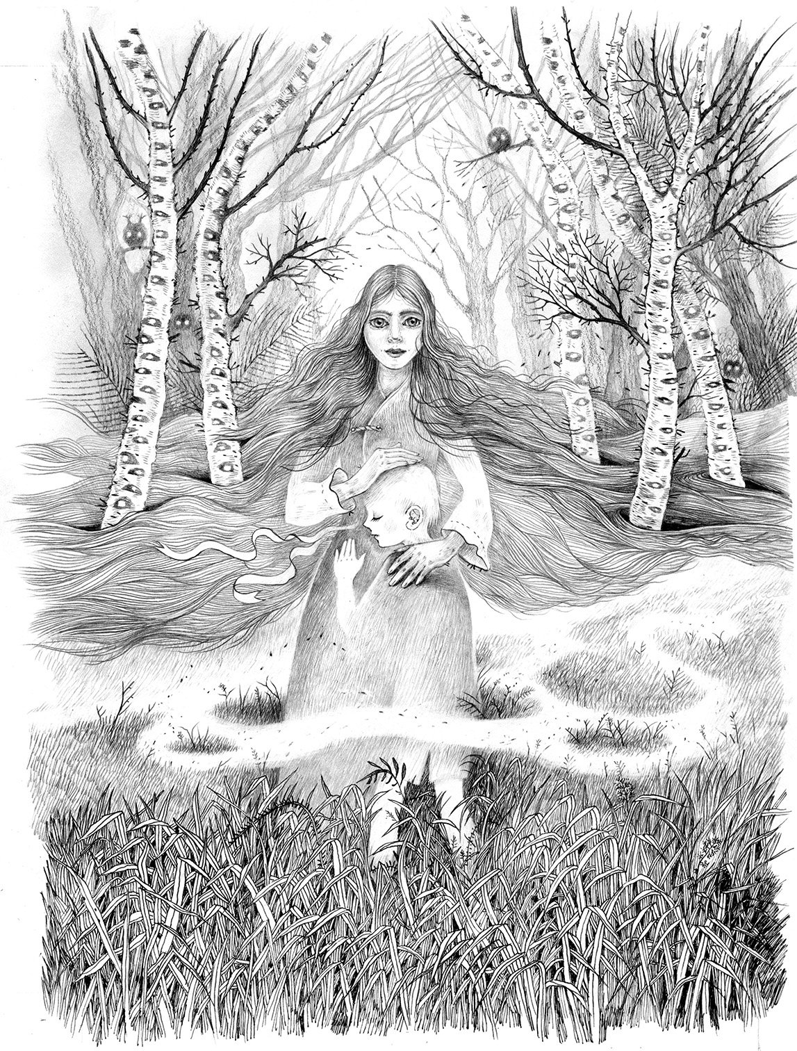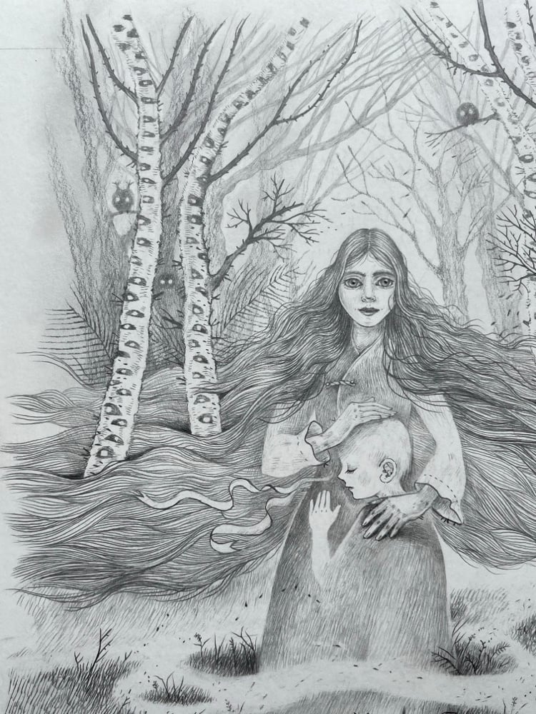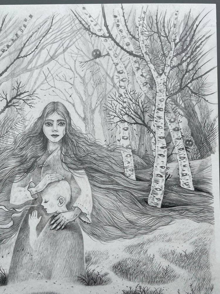 Forest Edge artwork, pencil on Fabriano 300gsm archival, acid free paper. Paper measures 11” x 7.8” (28cm x 20cm.) This piece was originally created for The Bog Chronicles/Klampyniu Kronikos, a Lithuanian book I was honoured to illustrate for award winning author Neringa Vaitkute.