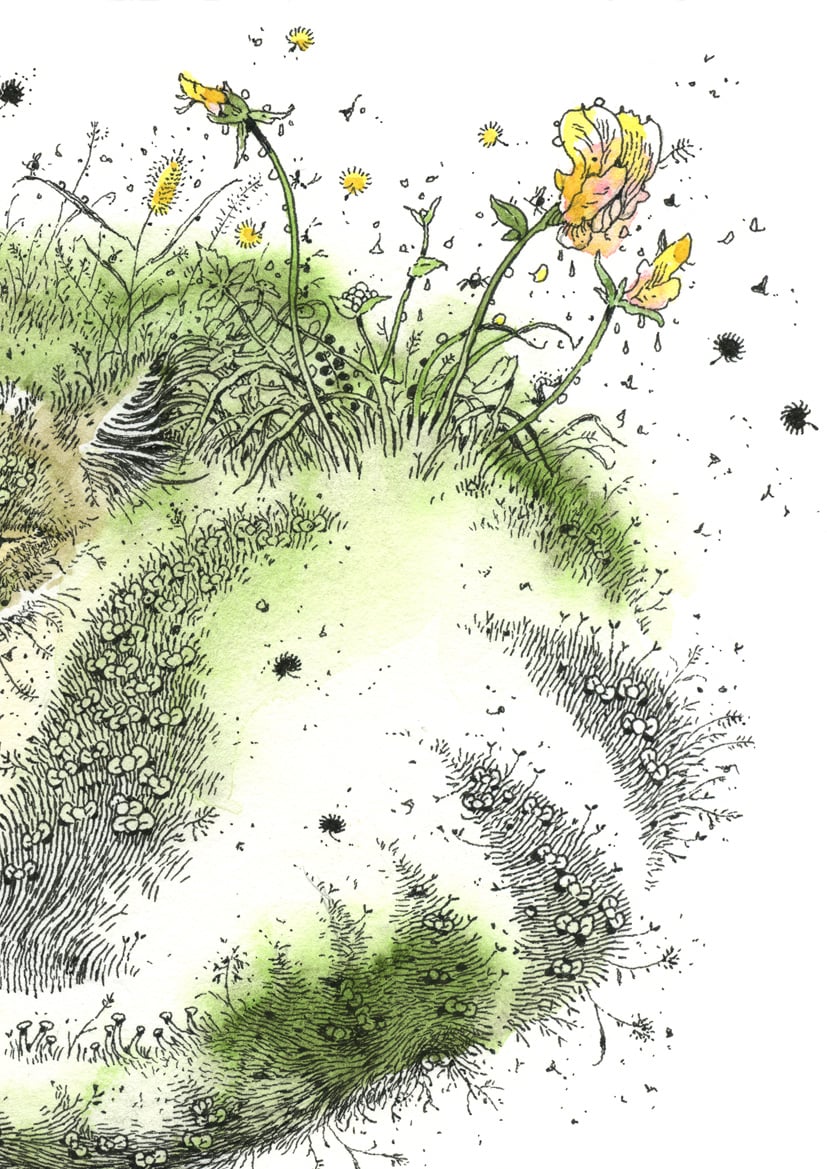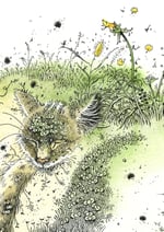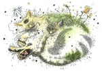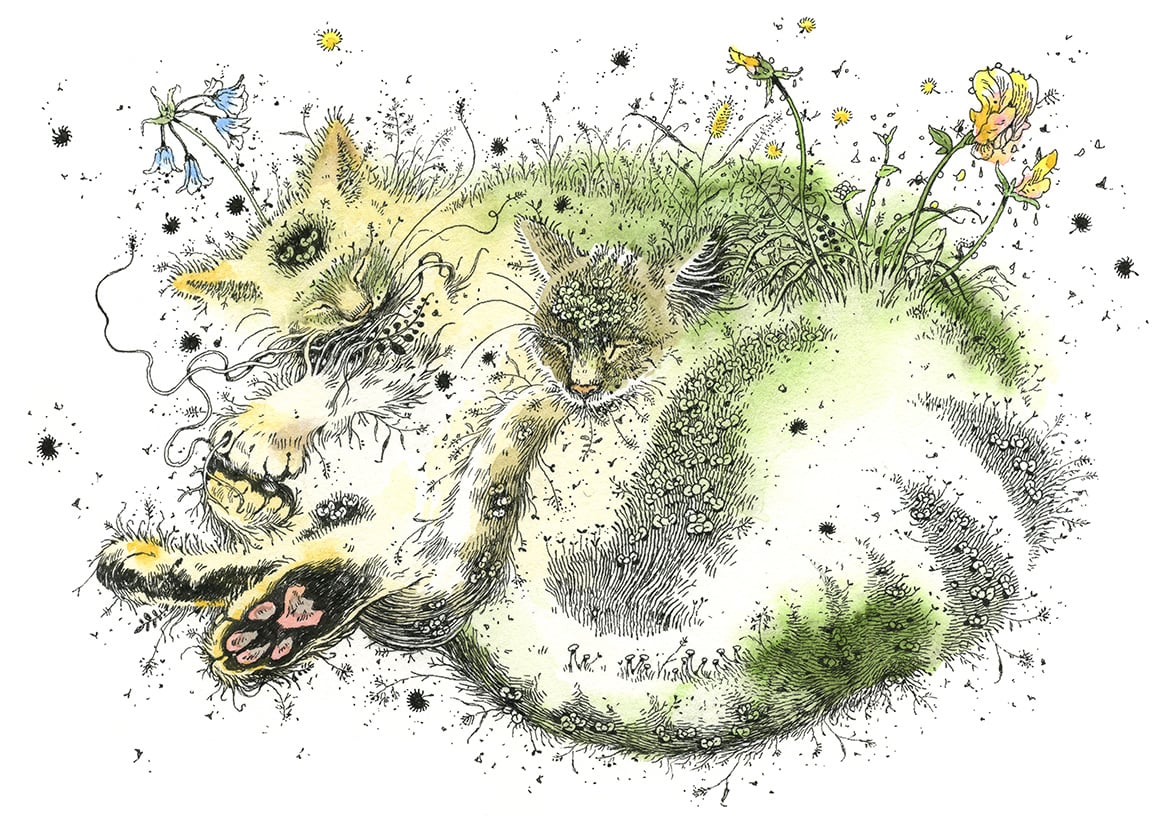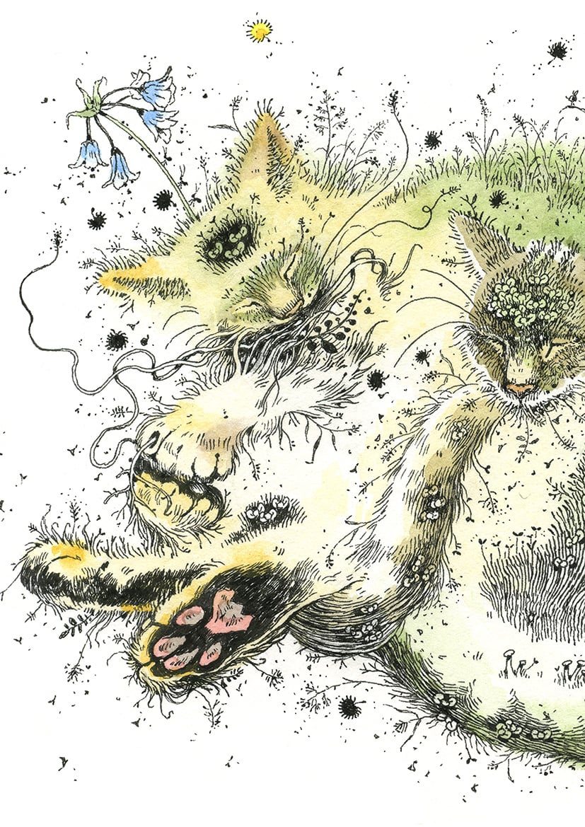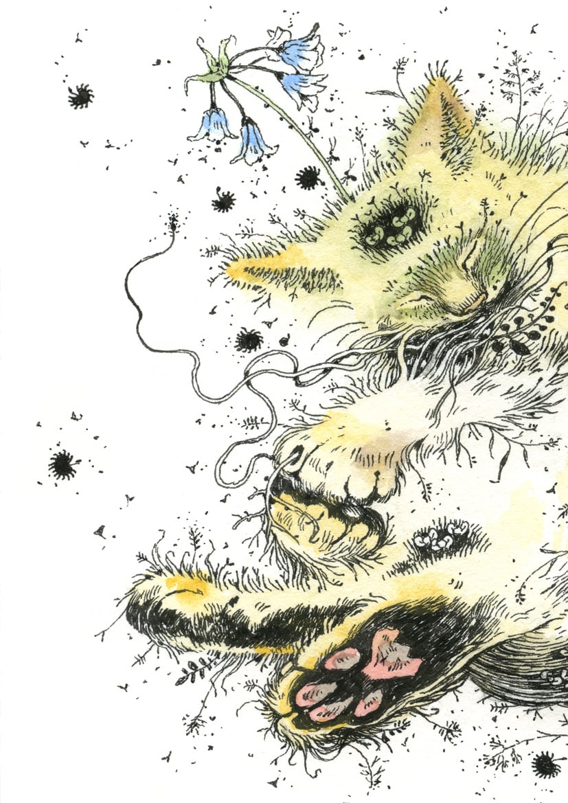 As a child I loved finding stray cats and bringing them home. Unfortunately, I had to do this in secret because my grandmother would never allow it. She really loved pets and flowers (that’s where I get my passion from) but even she had limits. So I was forced to hide the new arrivals in my room, in a box, in the closet, under my bed or in my bed. I loved to sit for hours stroking and caring for them, they needed me and I needed them. Usually they were all discovered after a couple of days and set free. That compulsion, the strong desire I had to befriend another little soul guides all these new artworks. With my pen and brush I stroke them for hours, attend to every tiny detail and fix every part of them, and all are lovingly adorned with beautiful flowers. I can make them happy and carefree and we can be together on the paper. The pets in the artworks are still not mine, but I no longer take them without asking. Instead, their owners kindly send me photos of their beloved creatures asleep. Influenced by the pose, shape and mood, I recreate a childhood memory of all the lost pets that I briefly loved and held before they were taken away. Now, undiscovered, they sleep peacefully and merge with their beds of vibrant flowers. Safe there, they’ll never go away and never be forgotten.
