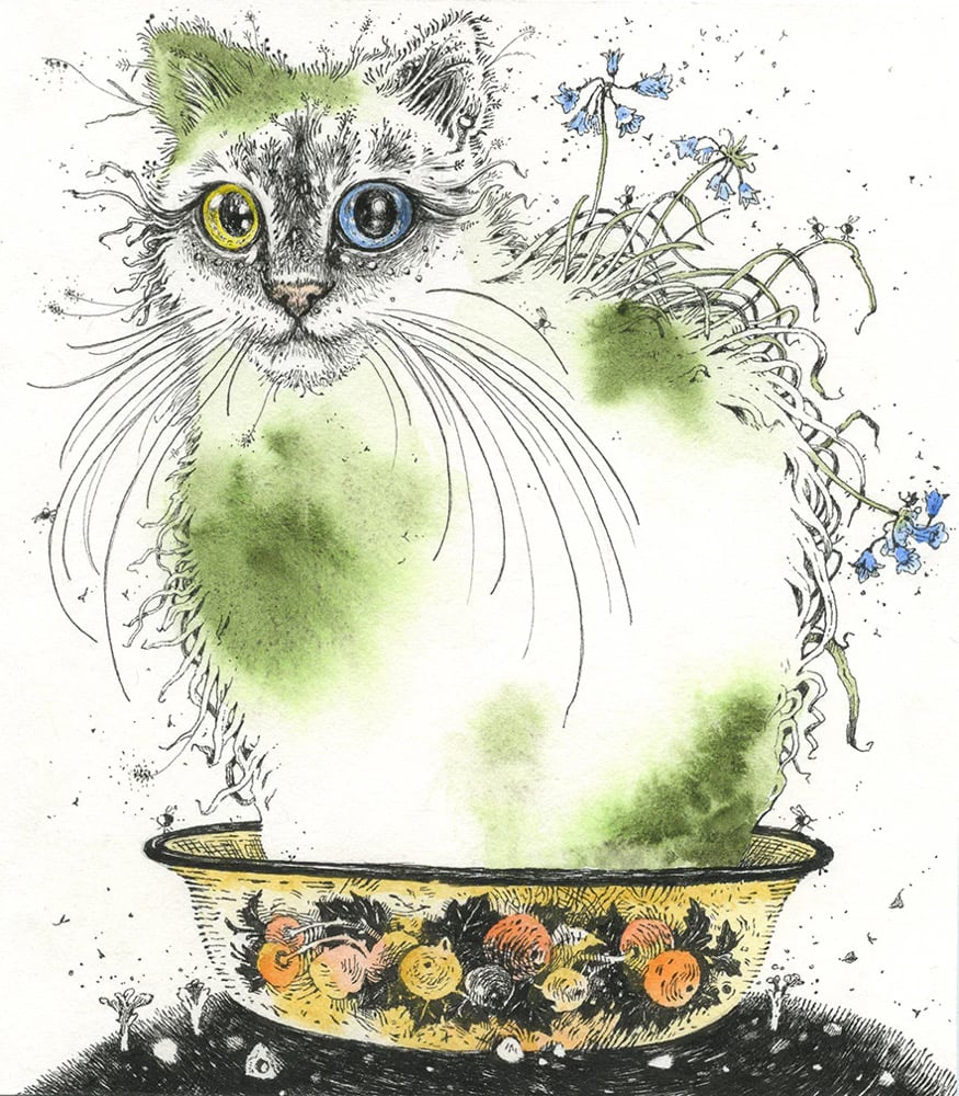 As a child I loved finding stray cats and bringing them home. Unfortunately, I had to do this in secret because my grandmother would never allow it. She really loved pets and flowers (that’s where I get my passion from) but even she had limits. So I was forced to hide the new arrivals in my room, in a box, in the closet, under my bed or in my bed. I loved to sit for hours stroking and caring for them, they needed me and I needed them. Usually they were all discovered after a couple of days and set free. That compulsion, the strong desire I had to befriend another little soul guides all these new artworks. With my pen and brush I stroke them for hours, attend to every tiny detail and fix every part of them, and all are lovingly adorned with beautiful flowers. I can make them happy and carefree and we can be together on the paper.